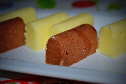 Compoziția obținută se poate împărți în două – o parte rămâne albă și cealaltă parte se amestecă cu cacao. Se așează în forme și se dă la rece.