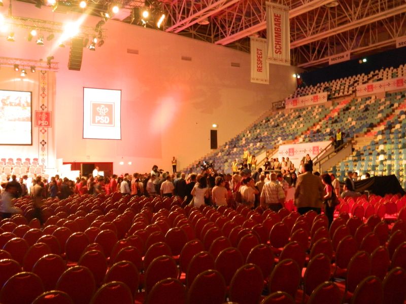 In loc de o baie de multime triumfatoare, candidatul PSD a mers printre scaunele goale, cu un mic cordon de PSD-isti in spatele sau. Nici strangeri de maini, nici urale, nici confetti, nici pancarte, nimic. Nici macar o melodie inspirationala.